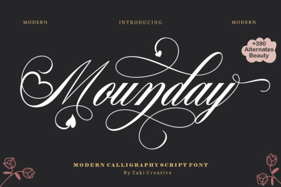 Because of its highly decorative nature, Mounday works best as a headline or title, paired with a simple, clean secondary font to maintain balance.