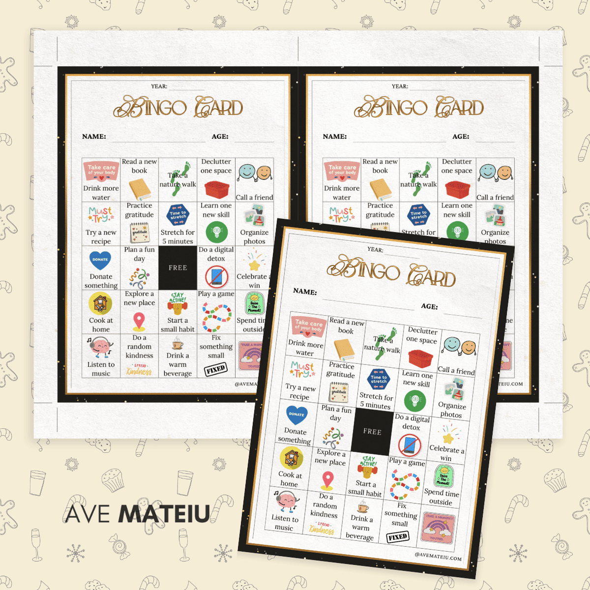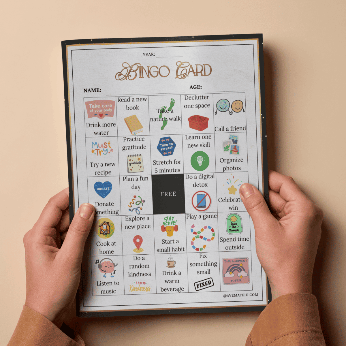 Traditional resolutions fade fast. A bingo game? Much easier to stick with. Each square represents a small, doable action: drink more water, declutter one space, call a friend, try a new recipe, or celebrate a win.