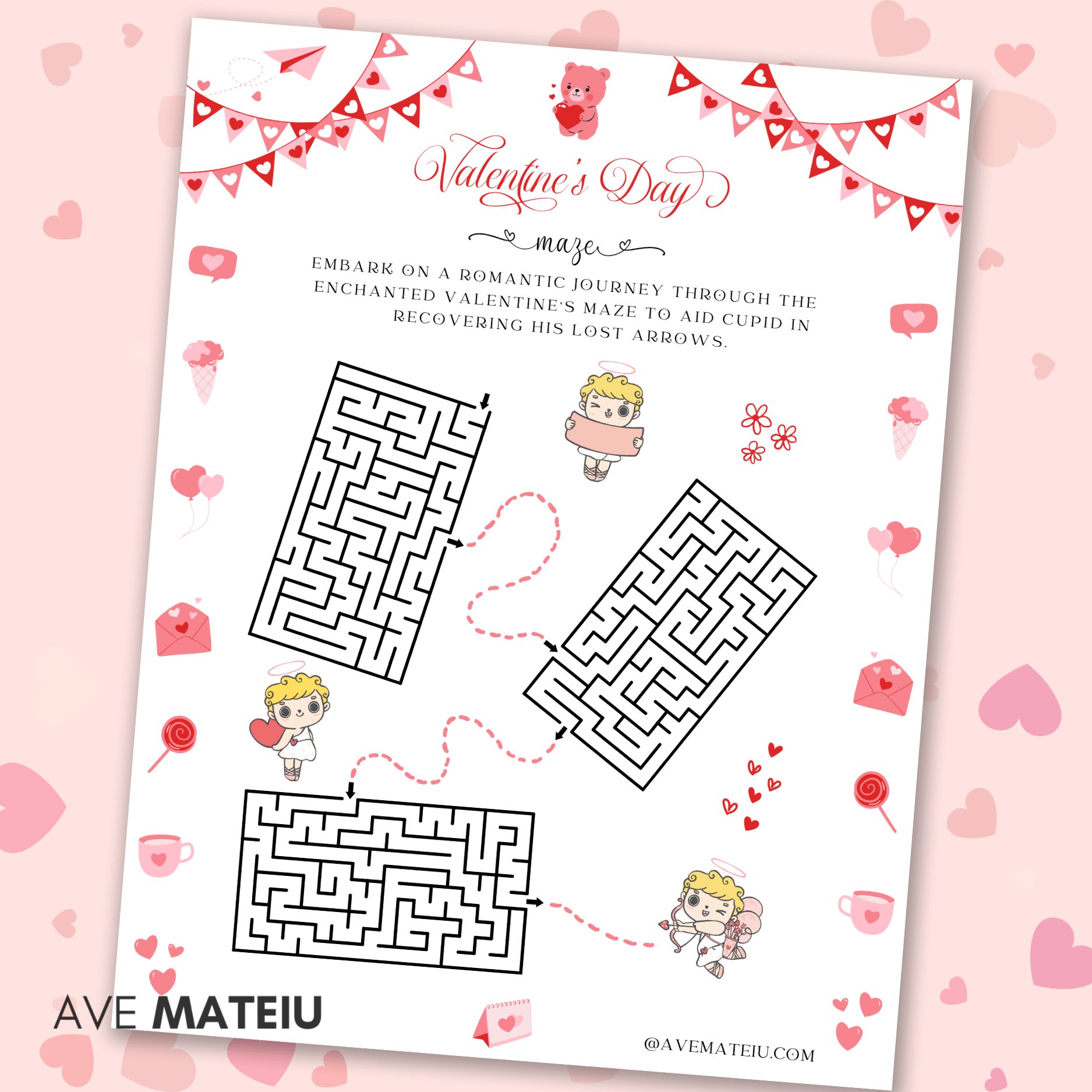 - Maze + The Answer Key: Test your kids’ problem-solving skills and let them navigate through intricate mazes designed to challenge their patience and determination. Can your child find the way to Cupid’s arrows?
